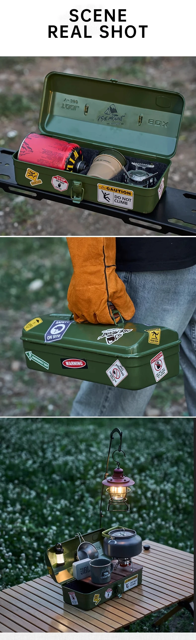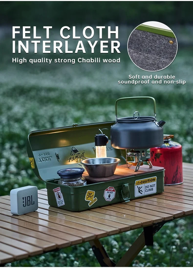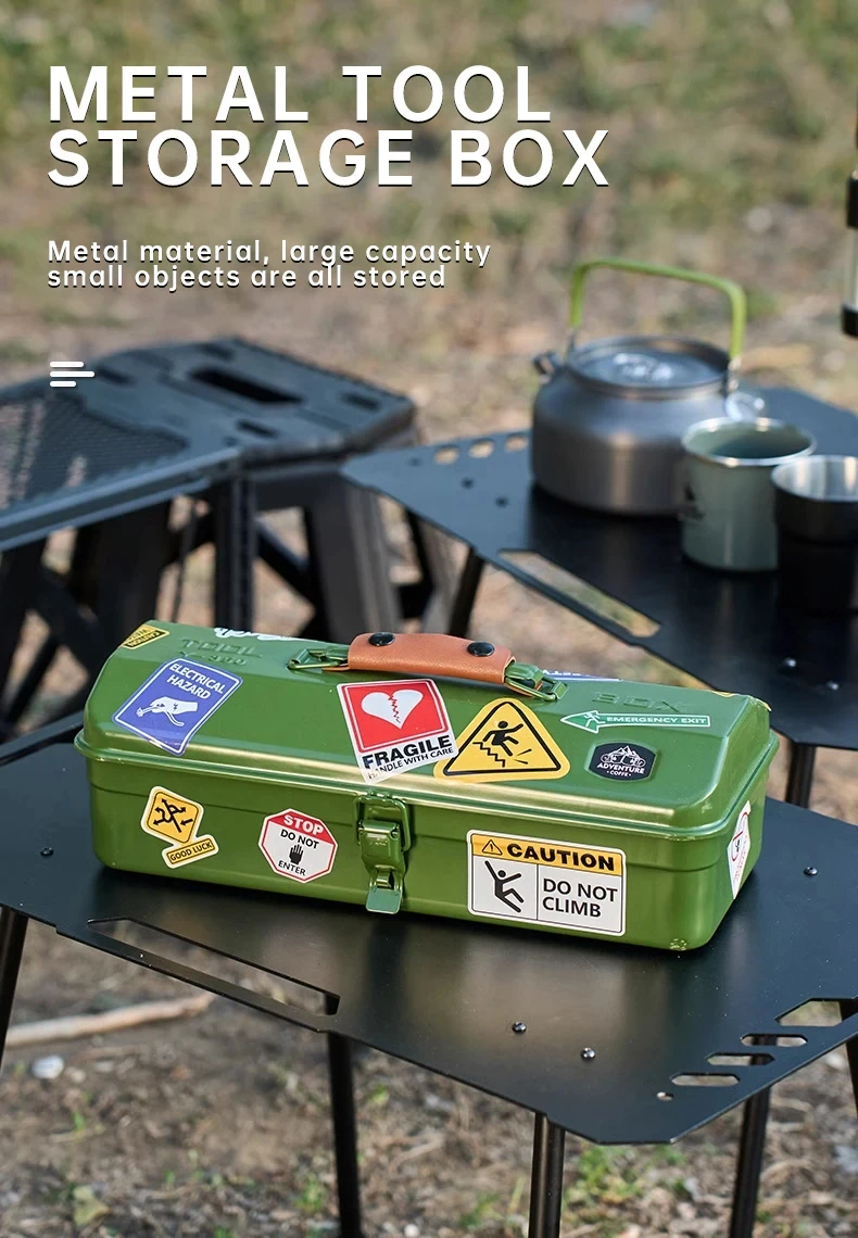 NOMAD OUTDOOR SUPPLY-Portable Metal Tool Box with Floating Design for Outdoor Camping Storage Featuring DIY Decoration Stickers and Steel Material